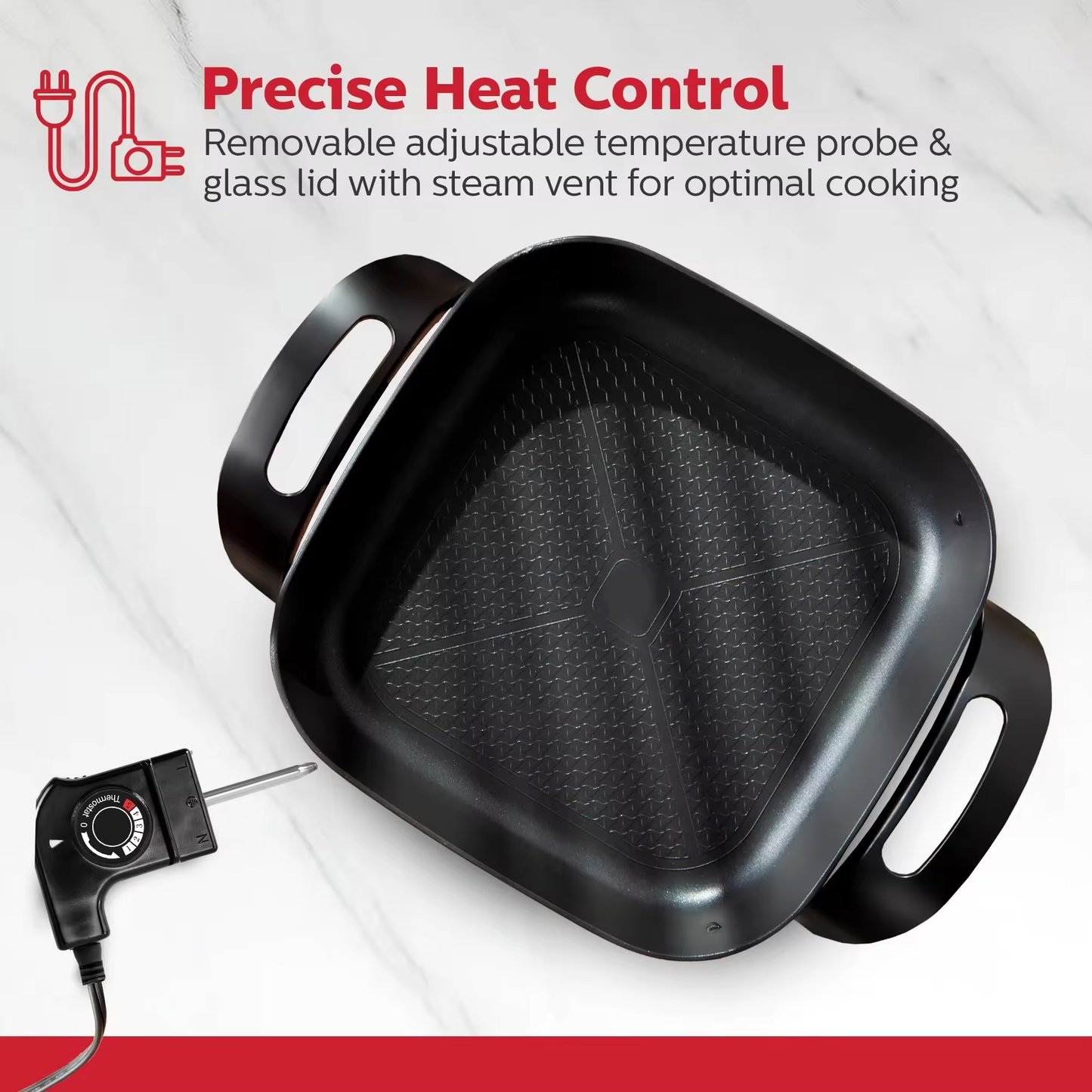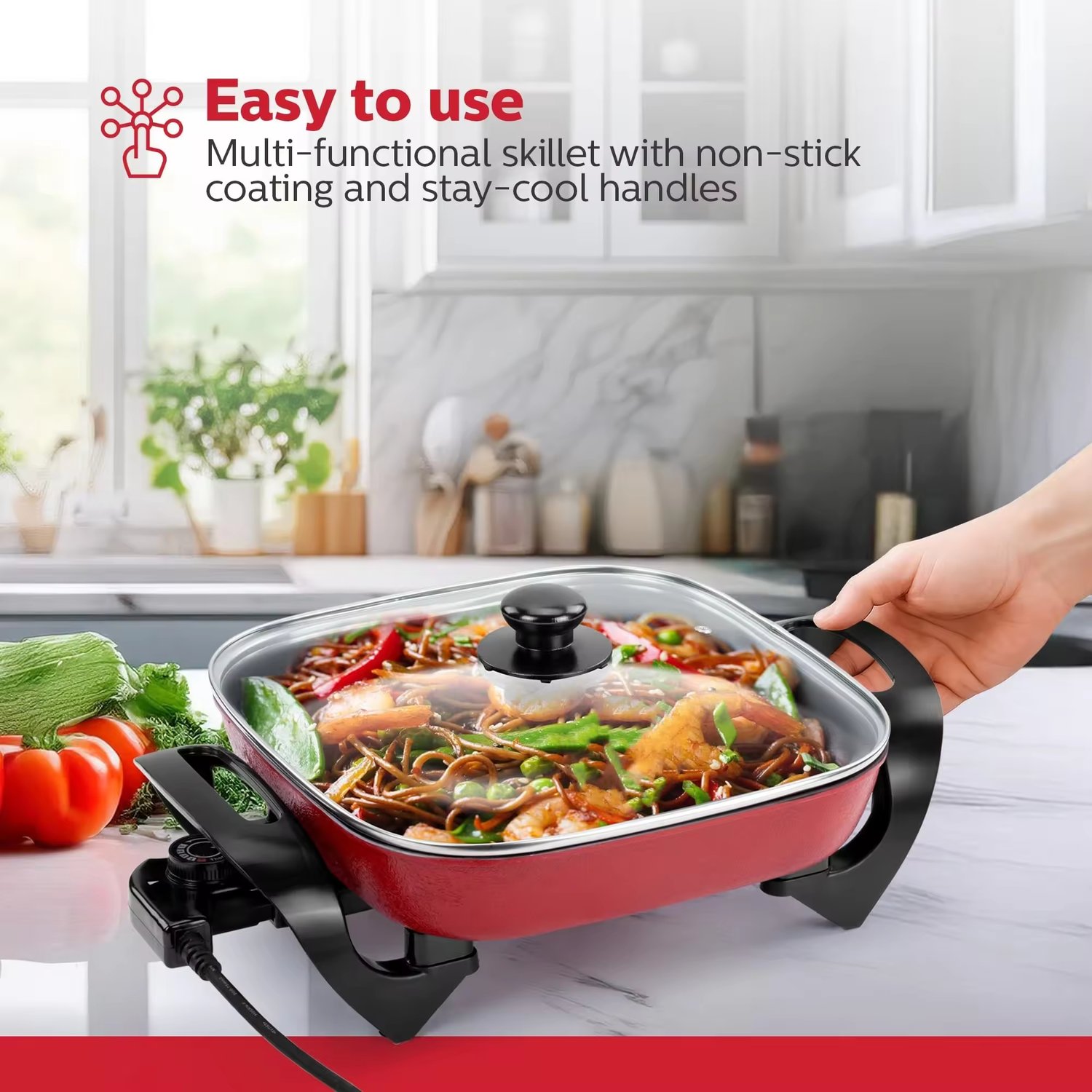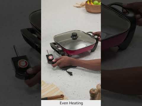 Experience versatile cooking with our 1500W Nonstick Electric Skillet, designed for large meals and easy cleanup. Its spacious surface ensures even heating for frying, sautéing, and simmering, while the durable nonstick coating prevents food from sticking. The included tempered glass lid locks in heat and moisture, enhancing flavor and efficiency. Perfect for families or meal prepping, this skillet combines power, convenience, and durability for all your cookware needs.