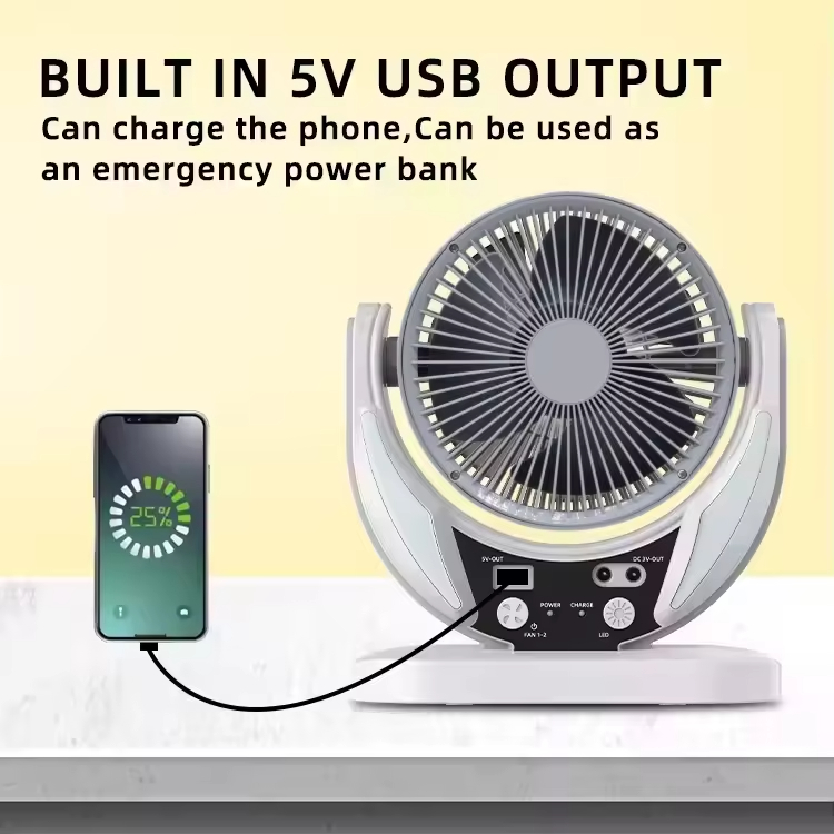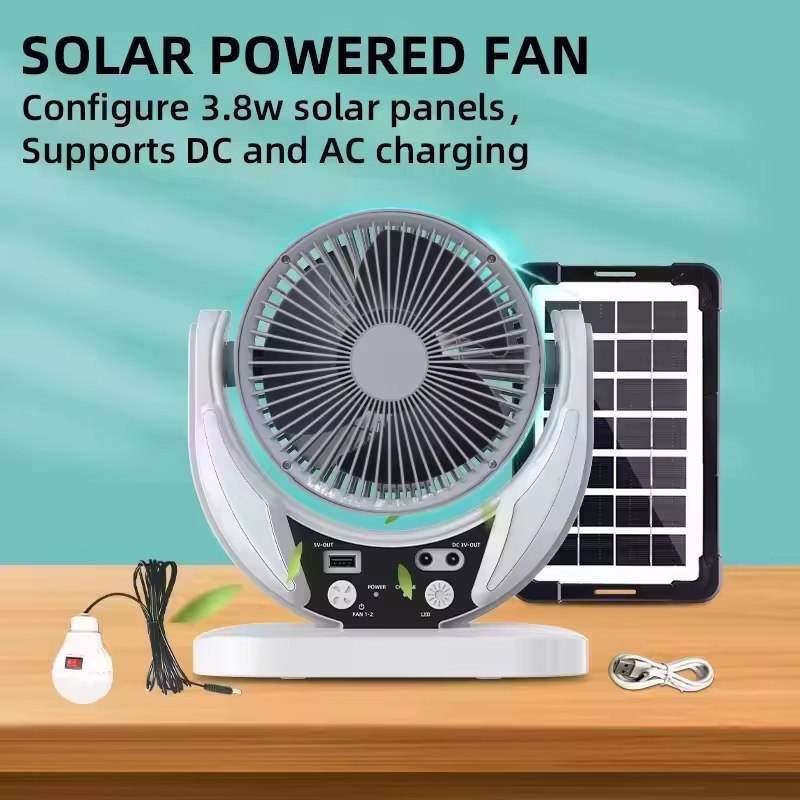 Stay cool anywhere with our Six Inch Solar Rechargeable AC DC Table Fan, perfect for both indoor and outdoor use. Designed for energy efficiency, it operates on solar power, AC, or DC sources, ensuring continuous airflow during power outages or outdoor activities. Its compact size fits perfectly on any table, delivering strong, adjustable breeze. Ideal for eco-conscious users seeking portability, versatility, and reliable cooling in one sleek, durable fan.